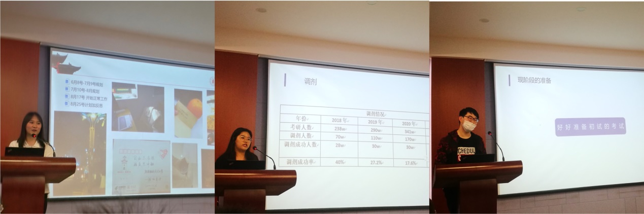 章老师从个人规划、就业形势、目前考研同学集中反映的困难以及考研相关准备等问题入手,为同学们进行了详尽的分析。他指出,同学们应尽早明确个人目标和定位,合理规划个人发展路径,精心准备,力争在2022年的深造和就业工作中取得满意结果。之后,我院2017级徐雅妮、周娟、刘哲三位同学分享了自己在考研规划和调剂等方面的心得体会。